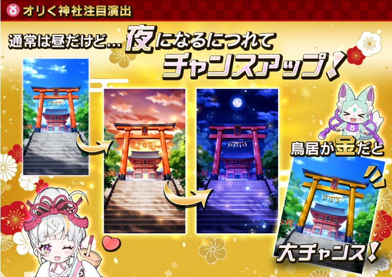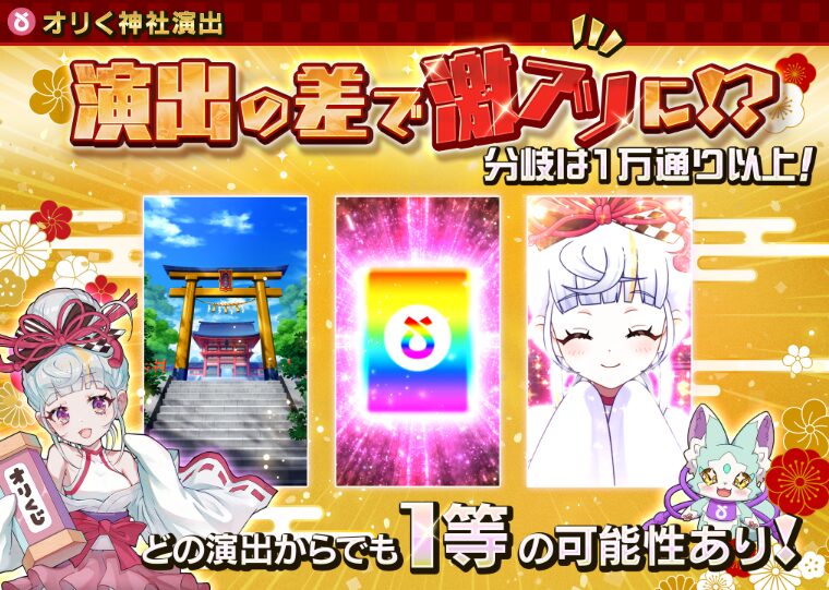 2025年現在、オリくじの主要演出には「オリく神社演出」「ステップアップ演出」があり、どちらもユーザーの期待度を高める仕掛けになっています。